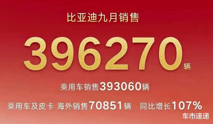 根据公开的销售数据显示,在刚刚过去的9月份,比亚迪单月销量高达396270台,其中,乘用车销售393060台,海外乘用车及皮卡销售70851辆,同比增长107%。今年1-9月比亚迪累计销量超过326万台,累计同比增长18.64%,乘用车及皮卡海外累计销量701579台。